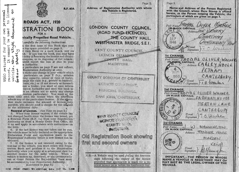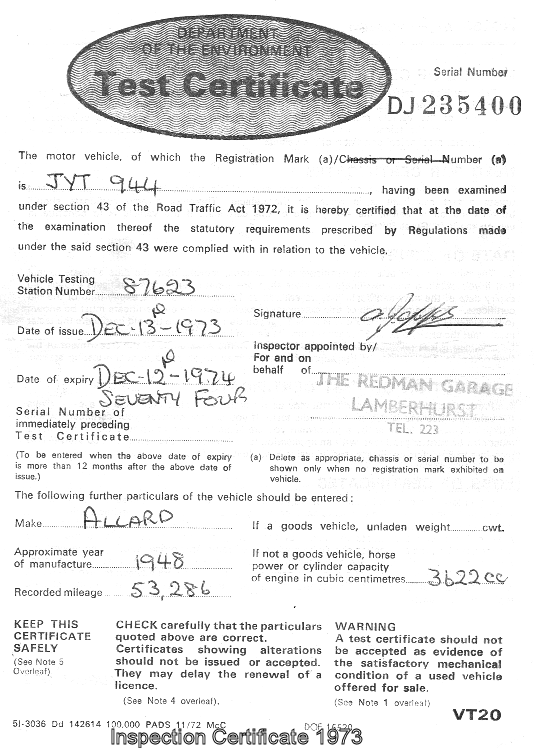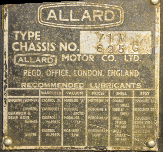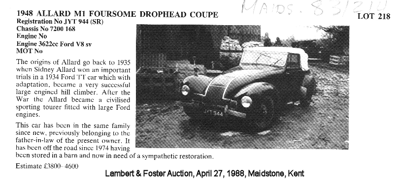 The ownership of this Allard is documented from new (all documentation included with the car). Allard M-1, no. M625, was sold in London on Sept. 6, 1948 to Thomas Oliver Wacher of Canterbury, Kent, England. It was transferred to the son-in-law of Mr. Wacher, J.W. Mannington of Marden, Kent in 1974. The original log book (see scan) shows the car's early ownership. The car remained in the same family until 1988, when it was purchased at auction by Brian Sharp of Broadway, Worcestershire. Mr. Sharp performed a complete restoration to original condition over the next several years and added it to his large and prestigious Allard collection. Much of the restoration was performed by Ken Price, a retired garage manager that worked full time caring for Mr. Sharp's collection. The ash frame was renewed and all of the original mechanical components were rebuilt. Mr. Sharp's collection was featured in an issue of Classic and Sportscar magazine in 1998 when he was selling off the entire collection. The current owner acquired the M type in 1998. After touring with the car in England, Wales, Scotland and Norway, he shipped it to Tulsa, OK, USA where it currently resides. In the US it has been a welcomed participant in events of the Early Ford V8 Club and various British car clubs. It has been driven approximately 5,000 miles since restoration, always garaged and currently shows 58,500 miles from new. Other than a few minor paint flaws the car looks as good as it did when restored. All electrical and mechanical features of the car work as they should, except for the fuel gauge needing attention.