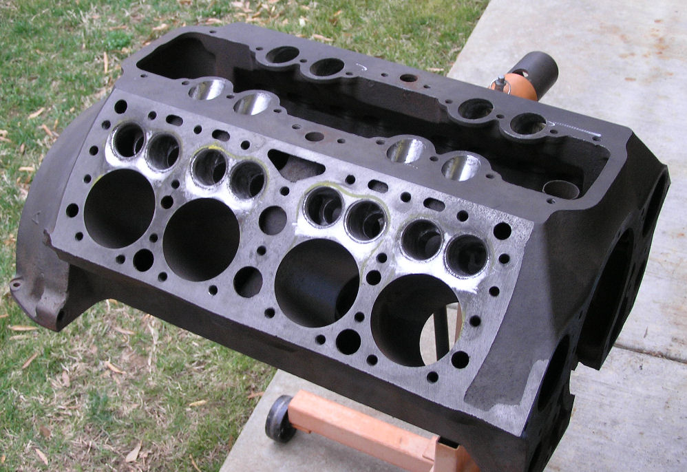 This is another one of our projects, a 1940 Ford pickup. It was to be Tom's high school car, but we didn't get it done in time. The engine block is a 59AB and is shown after our mild port and relief job. It will get a Merc crank offset ground for 4 1/8 stroke, bored 1/8 over, Skat H-beam rods, Offy finned aluminum high compression heads and two deuce carbs and manifold. Originally, we purchased a 3/4 race cam from a name brand manufacturer. When we degreed it, we discovered it was not as advertised - another lazy slow opening cam. So, the pickup will get our own Tilden V8 220 cam - 249 degrees seat-to-seat, 220 degrees at 0.050 and 0.360 lift. It has a quick opening with lots of lift, and not too much duration. Click on photos to enlarge.